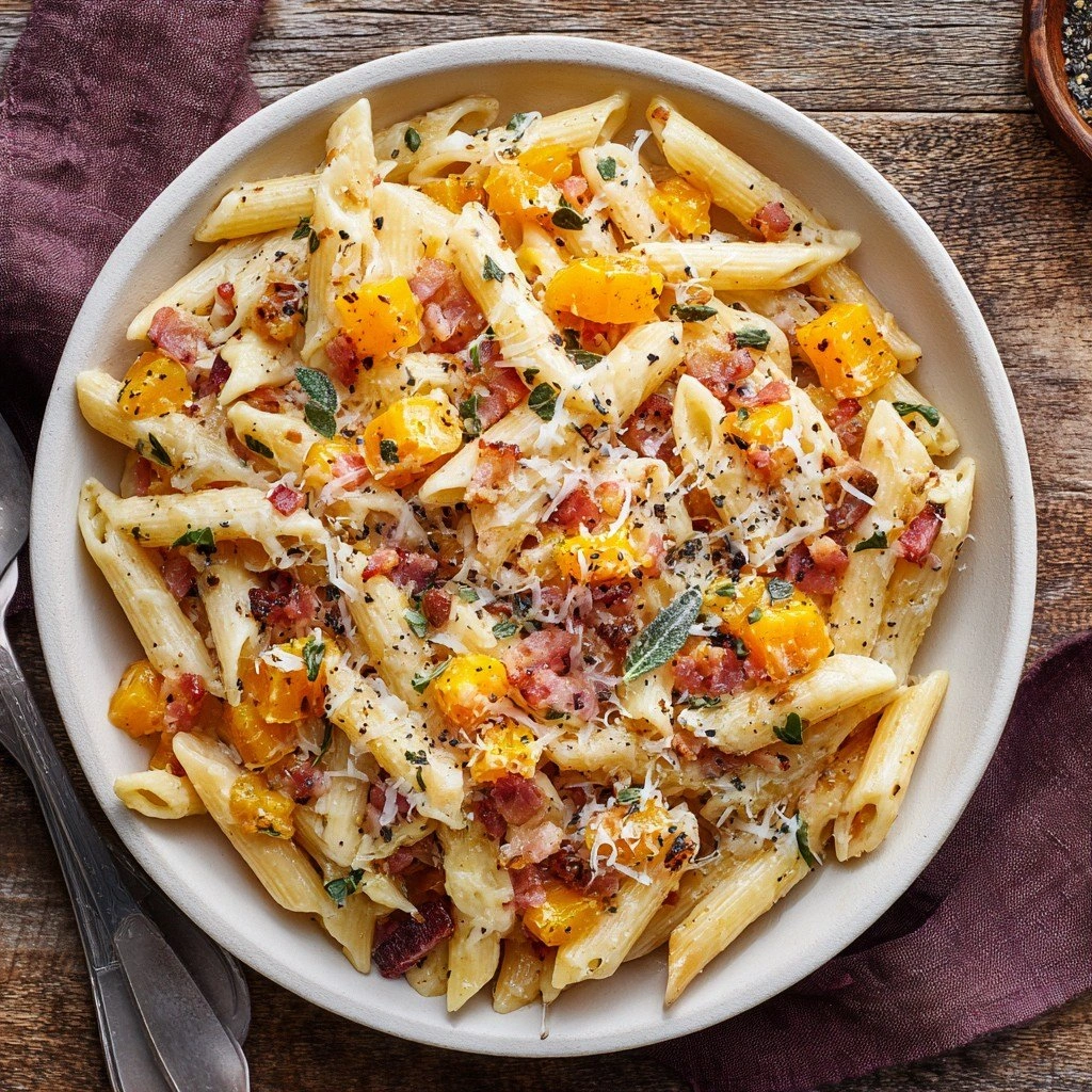 In that instant, the air was thick with the sweet scent of roasted squash, the metallic tang of pancetta sizzling in olive oil, and a faint whisper of sage that promised depth. The sound of the skillet was a steady drumbeat, punctuated by the hiss of garlic and the gentle clink of a wooden spoon against the pan. My eyes drank in the golden glow of the caramelized edges, the glossy sheen of the cream coating the pasta, and the specks of pepper dancing like tiny fireworks. My fingers tingled with anticipation, the heat from the stove warming my palm as if the dish itself was breathing. The texture, from the tender bite of the squash to the chewy penne, was a symphony of contrasts that made my mouth water.